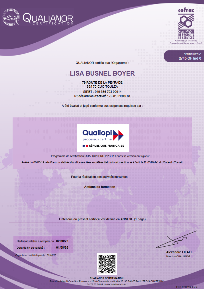La certification Qualiopi est une reconnaissance officielle de la qualité de mes prestations.